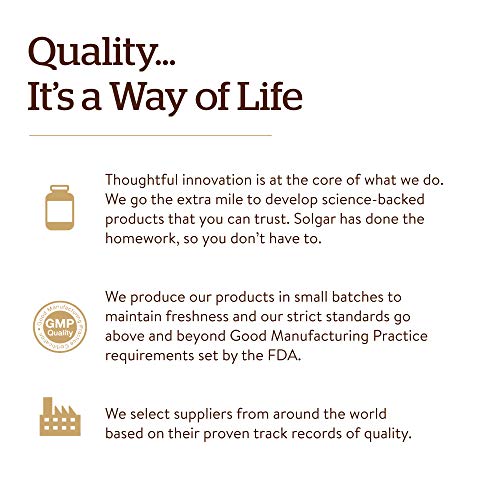 - Der Goldstandard; Seit über 70 Jahren setzt sich Solgar für Qualität, Gesundheit und Wohlbefinden ein; Unsere Mission ist es, die besten Nahrungsergänzungsmittel in kleinen Chargen zu erstellen, durch unermüdliche Forschung, unter Verwendung nur der besten Rohstoffe